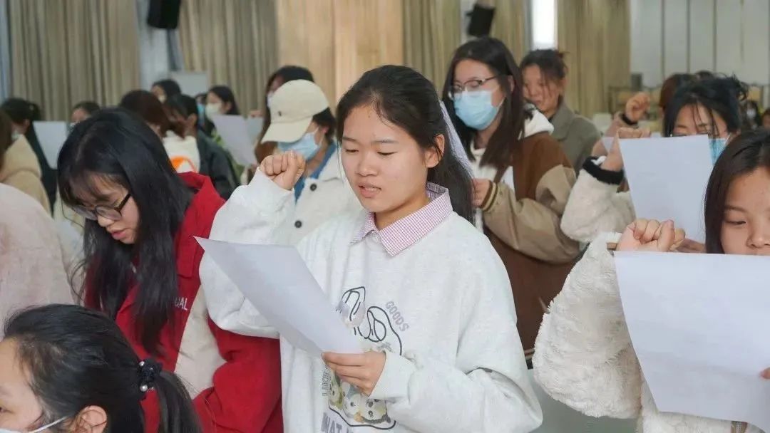 随后在吴龙妹的带领下全体21级高端班的学生们在承诺书上郑重签名并宣读承诺书。铿锵有力的宣誓词,清晰响亮的宣誓声,展示着领鹿学子决胜幼儿教资的信心和决心。