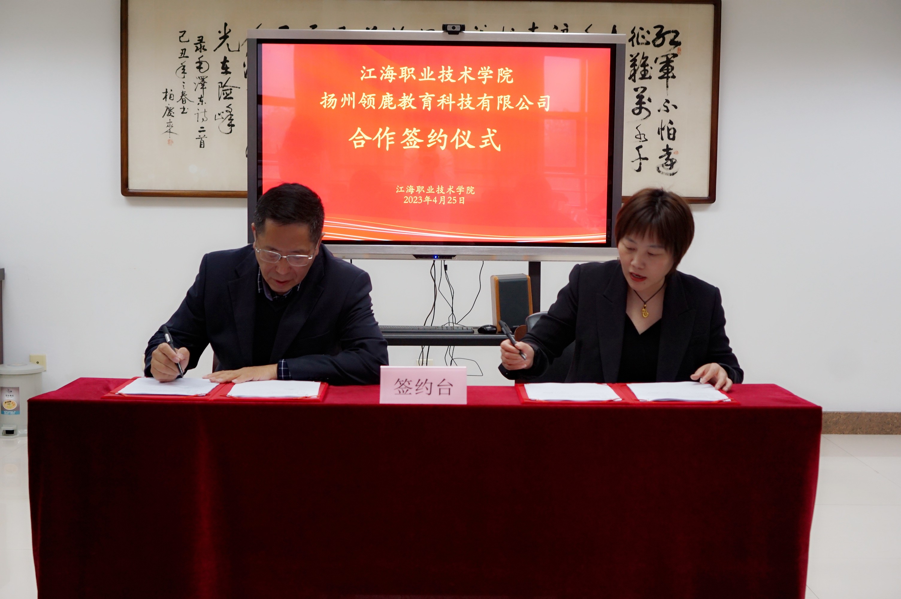 4月25日下午,江海职业技术学院和领鹿教育合作签约仪式在江海职业技术学院图书馆5楼会议室举行。