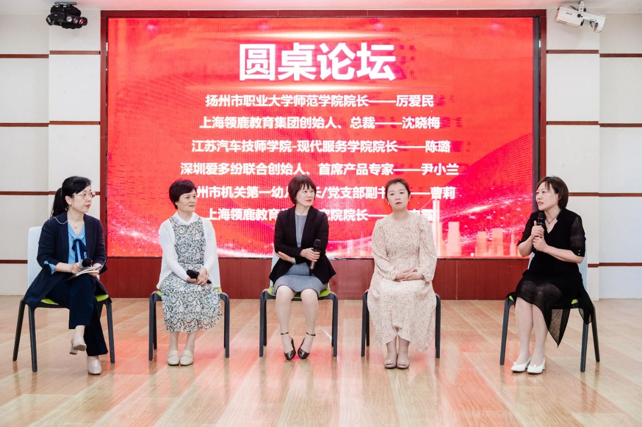 圆桌论坛环节,领鹿教育创始人、总裁沈晓梅主持,江苏汽车技师学院-现代服务学院-院长陈璐、深圳爱多纷联合创始人尹小兰、扬州市机关第一幼儿园长/党支部副书记曹莉、上海领鹿教育集团研究院院长赵老师参加圆桌论坛,嘉宾针对当下托育行业大环境,对幼儿园下延发展趋势及园所如何提升0-3托幼板块等话题进行了深入讨论。